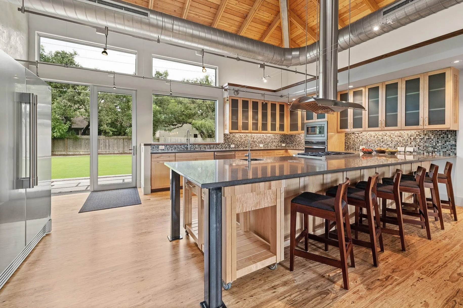 The heart of this home is designed for entertaining. The open floor plan kitchen, dining, and living areas boasts over 1300 square foot floor space and a ceiling height that peaks out at 26 feet. Expansive picture and clerestory windows, and an additional light well, bathe the great-room’s calming variety of textures and colors in diffused natural light.