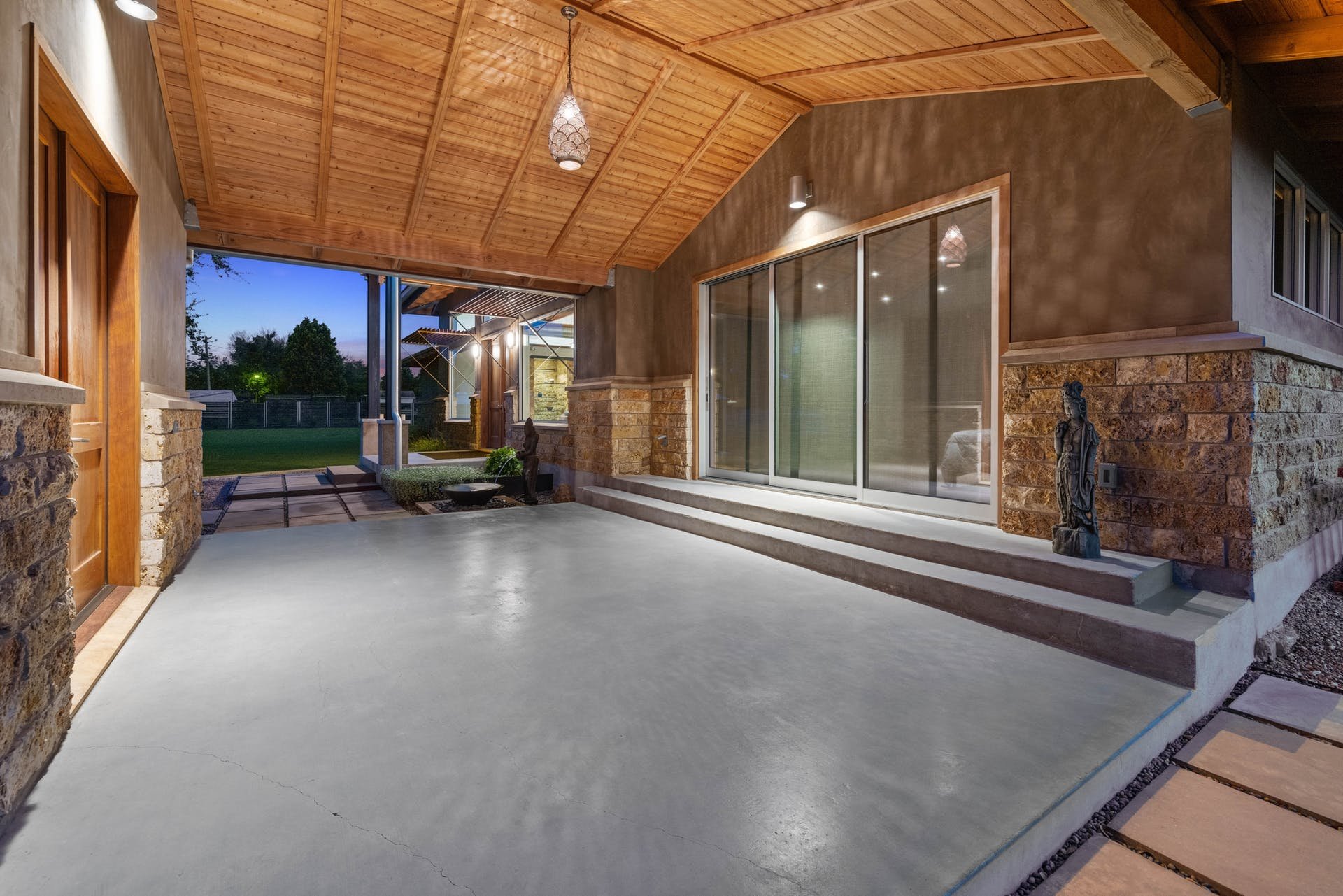 The clerestory windows and an enormous 9ft frosted glass garage door provide plenty of natural light. Wooden beams, a 8 ft. Big Ass Fan, and commercial grade stainless dog wash/utility sink, not to mention the whole house reverse osmosis system are just a few notable features.
